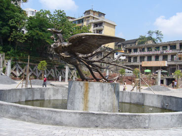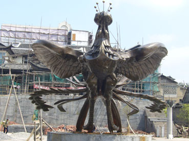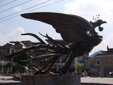 對(duì)古城的另一種破壞是“新景觀”。目前在新舊城的接壤處正在建一個(gè)廣場,現(xiàn)代化的水泥柱正拔地而起,一座用黃銅鑄造的“鳳凰雕塑”挺立在廣場的中央。遺憾的是,此“鳳凰”(見圖片)造型完全打破了人們對(duì)這只吉祥鳥的美好想像。正如來自上海和香港的游客所形容看過后的感受,像一只“落湯雞”,完全不能與古城相匹配。