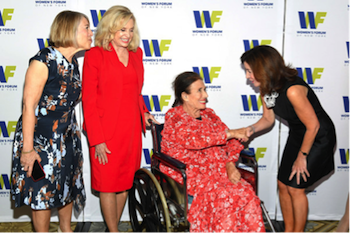 補記:6月22日馬喬里給我發(fā)來郵件,欣喜地告訴我Muriel Fox于6月15日坐著輪椅出席了當(dāng)天在紐約舉行的The 9th Annual Elly Awards Hosted By The Women's Forum Of New York – Arrivals,并獲了大獎,表彰她始終不渝地為美國婦女運動所做出的杰出貢獻(xiàn)。這一獎項去年頒發(fā)給了希拉里·克林頓。Muriel Fox以91歲高齡(一個月前她遭遇了車禍)獲此殊榮。她是一個極其偉大與堅強的女性,也是美國女權(quán)運動的杰出領(lǐng)導(dǎo)。
