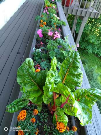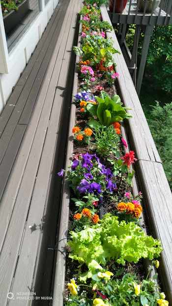 馬喬里在陽臺上利用多個空間種植了鮮花和“時蔬”——幾種生菜、香菜、蘿卜、芹菜,一盆盆、一畦畦都生機盎然、碩果累累。我在這里吃的每頓“沙拉”全部來自這里。