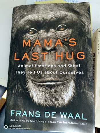 馬喬里還從她的書堆里拿出一本書,書名:MaMa’s Last Hug: Animal Emotions and What They Tell Us about Ourselves的新書。作者Frans de Waal通過四十年與對靈長類動物的觀察與生活,認(rèn)識到動物感情的細(xì)膩與敏感。MaMa是一只有四十歲高齡的狒狒的名字,作者與它接觸了四十年,就在書出版前離世。Frans de Waal因為與靈長類動物的生活在動物心理學(xué)方面有所發(fā)現(xiàn),而獲得《時代周刊》一百名最具影響力的人的榮譽。這本書的核心思想是說,動物同樣具有很高的情感交流能力,而非人類專屬,告誡人們應(yīng)平等地對待一切生物。 這里不得不說交流中的一個插曲:馬喬里家的“珍妮公主”,今年八歲半,按照狗的壽命算如今已是老年人。“珍妮公主”也算是馬喬里夫婦的“掌上明珠”,是她們的好“女兒”、好伴侶,生活難免不奢侈,“同食一鍋飯,同住一張床”。我調(diào)侃道:“這是不是發(fā)展不平衡、不公平。珍妮的生活水準(zhǔn)遠(yuǎn)遠(yuǎn)超過了落后國家兒童的生活水準(zhǔn),不是嗎?”馬喬里還有點當(dāng)真了,說道:“惠娣,難道你希望珍妮也像難民的孩子們一樣嗎?”沒過多時,她便拿出了這本書。