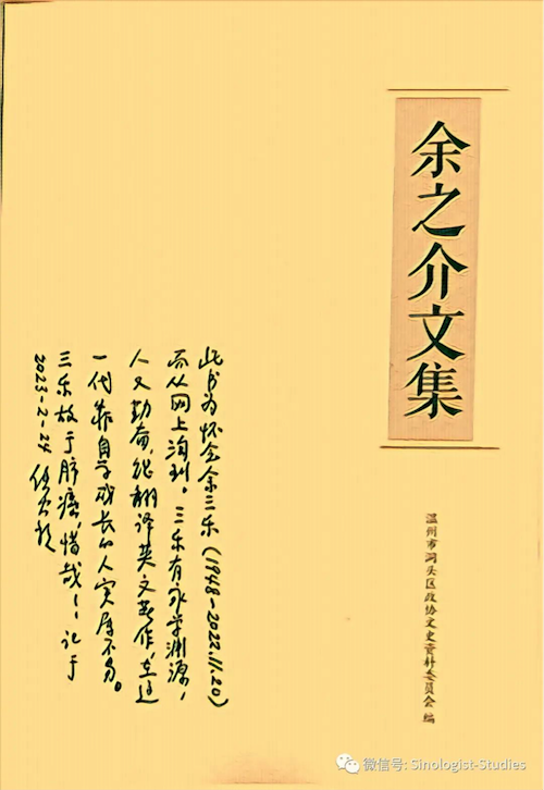 疫情期間,有的朋友去世,但也無(wú)法參加悼念,有的甚至沒(méi)有消息。記得老友余三樂(lè)(1948-2022.11.20)病故,我大約今年2月才知道,我淘到一本三樂(lè)父親的文集《余之介文集》,是溫州地方上印的,讀這本書(shū),我更了解了三樂(lè)和他的家庭。三樂(lè)出身革命家庭兼書(shū)香門(mén)第,其父余之介,1907年生于溫州北岙,1926年參加革命、1938年入黨,當(dāng)時(shí)與郭沫若等許多著名愛(ài)國(guó)民主人士友誼深篤,1947年4月余之介結(jié)婚時(shí),郭沫若和黃炎培、沈鈞儒、葉圣陶等專(zhuān)程赴賀。郭沫若以新人夫婦“均從事教育,志同道合,結(jié)為佳偶”有感,特書(shū)《桃李花秾》以祝,其中有云:“君植李,我植桃,桃李花秾春正好。坐春風(fēng),席春草,不愿門(mén)墻高,只愿蹊徑少,春申江上樂(lè)淘淘。”
