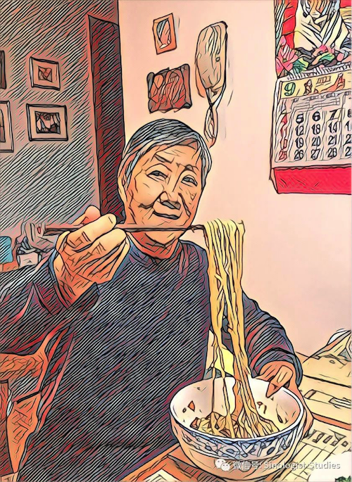內(nèi)子今年70大壽,我親自為其做長(zhǎng)壽面,用陜西“老碗”上桌,她的動(dòng)作,北京人叫“挑壽”。 夏天我們到張家口避暑,景點(diǎn)大境門(mén)的街頭畫(huà)家高先生,給我們作了漫畫(huà)。